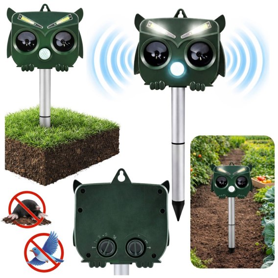 Solarny Odstraszacz Zwierząt Sowa Czujnik Ruchu Ultradźwięki Diody LED LEAN