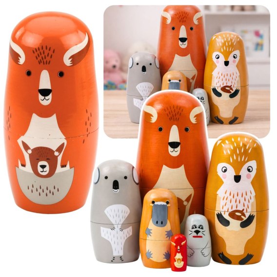 Drewniana układanka typu matrioszka z motywem zwierząt leśnych to edukacyjna zabawka, która łączy naukę z zabawą. Zestaw składa się z 6 elementów w różnych rozmiarach, które można wkładać jeden w drugi tworząc klasyczną wieżę matrioszkę.