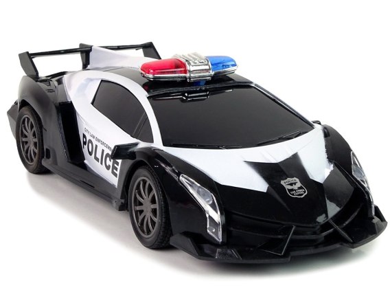 Prezentowany samochód w charakterystycznym biało czarnym kolorze rozwinie wyobraźnię dziecka i pozwoli na kreatywną zabawę . Dodatkowo efekty świetlne dodają realizmu zabawce.